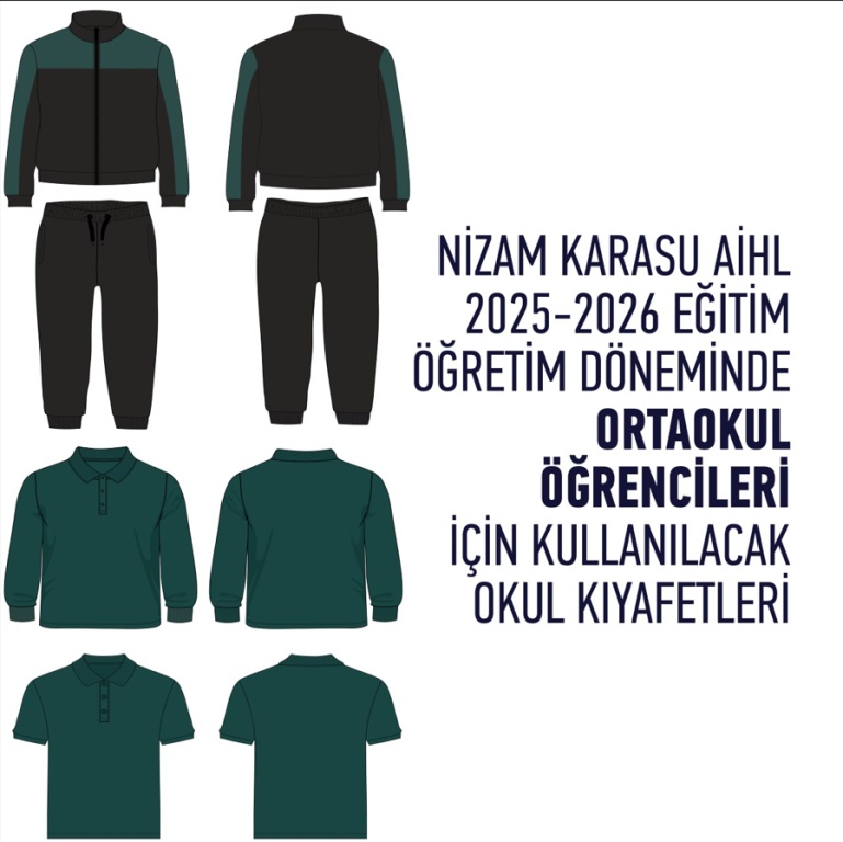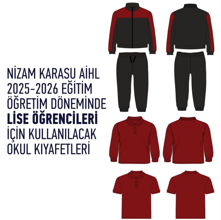 2025-2026 Eğitim Öğretim döneminde kullanılacak okul kıyafetleri belirlendi. Okul kıyafetlerini okulumuz haziran ayı itibariyle ana bina kantininden ya da farklı yerlerden temin edebilirsiniz. Farklı yerlerden temin edilen kıyafetlerin renklerinin okul kıyafetlerinin renkleriyle uygun olması gerekmektedir.